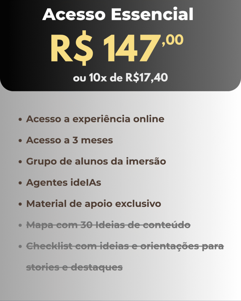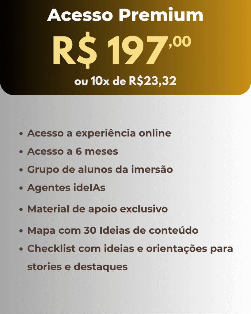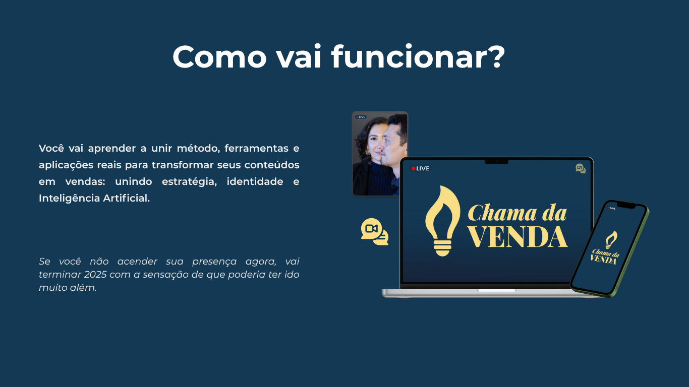 Você vai aprender a unir método, ferramentas e aplicações reais para transformar seus conteúdos em vendas: unindo estratégia, identidade e Inteligência Artificial.